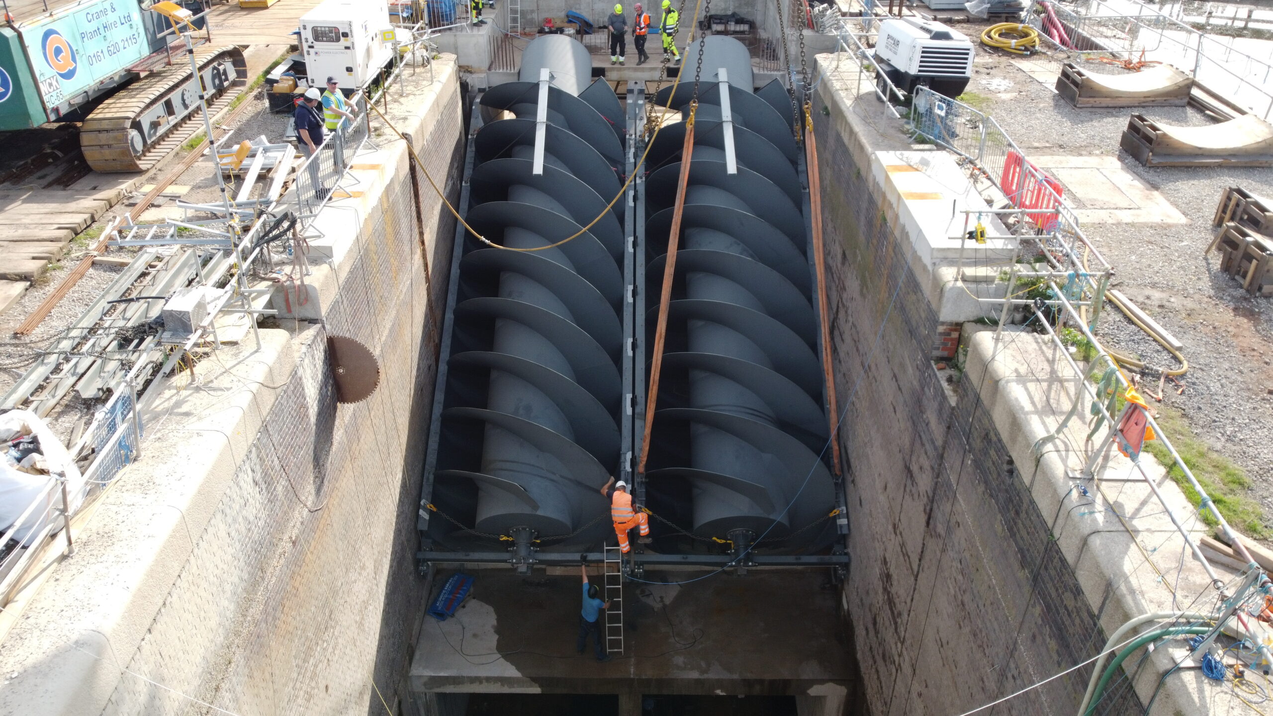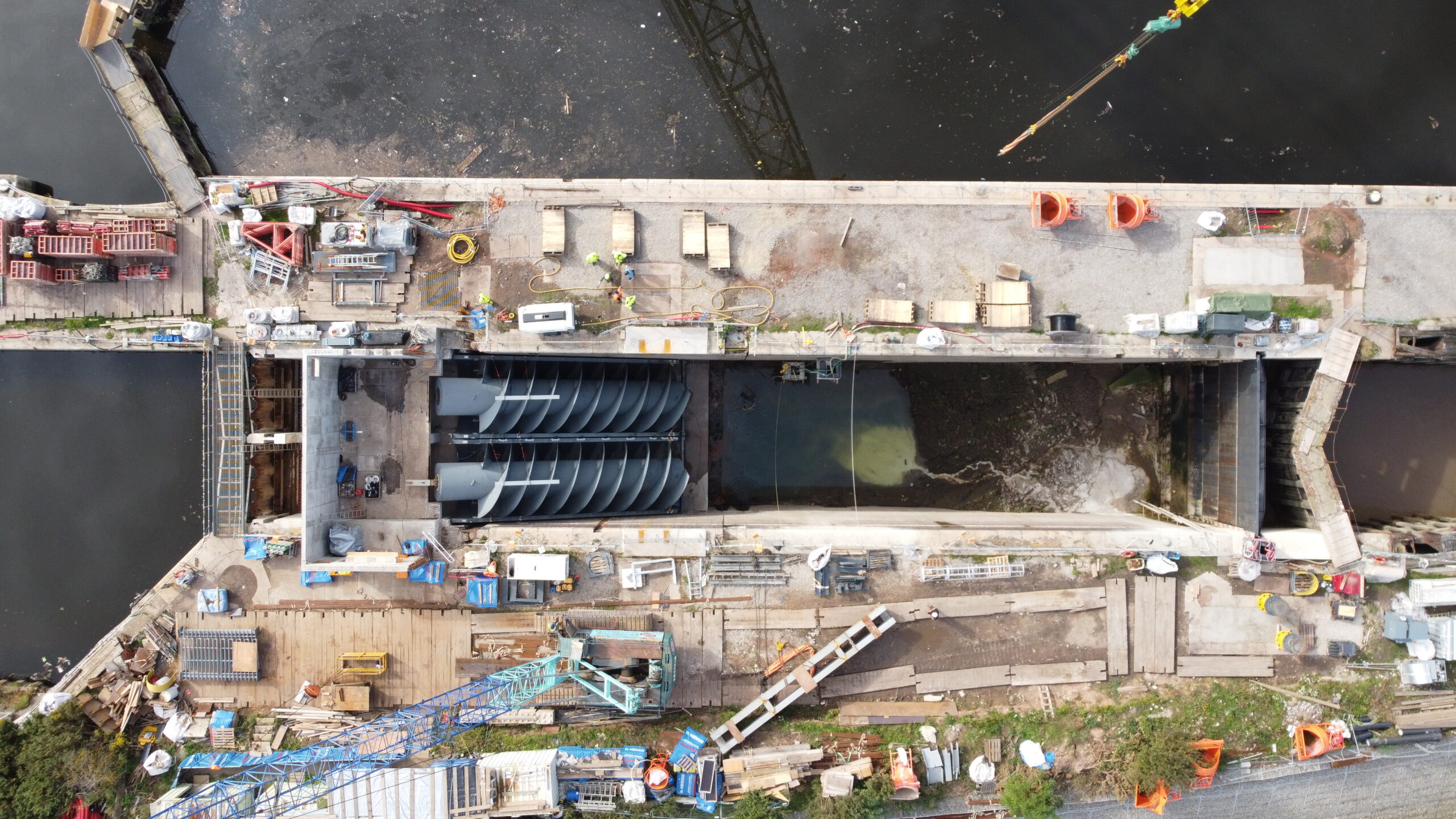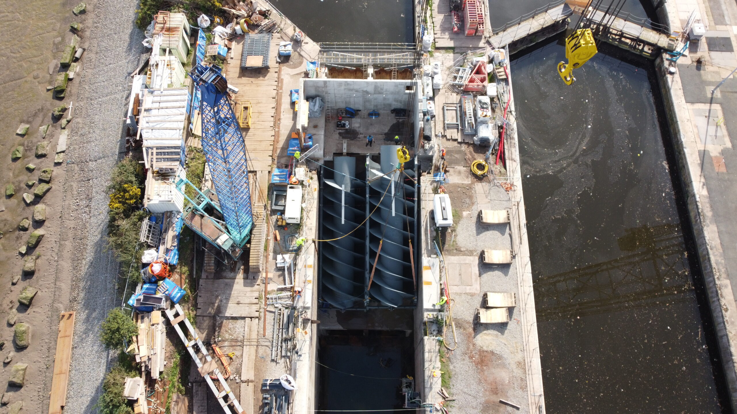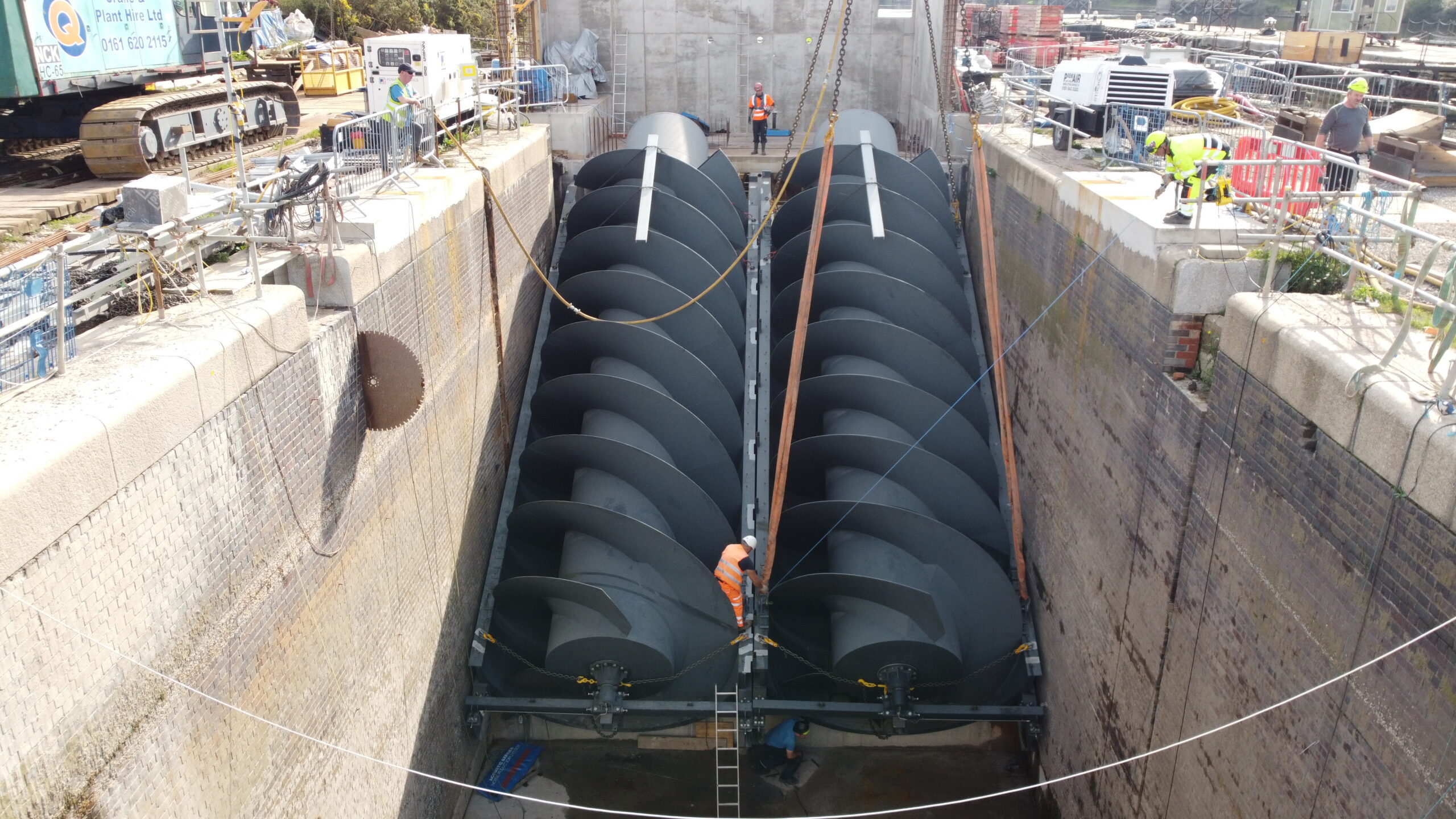 Moderní vodní elektrárna využívající Archimédovy šrouby pro ekologickou výrobu energie ze spádu mezi řekou Mersey a Manchester Ship Canal.