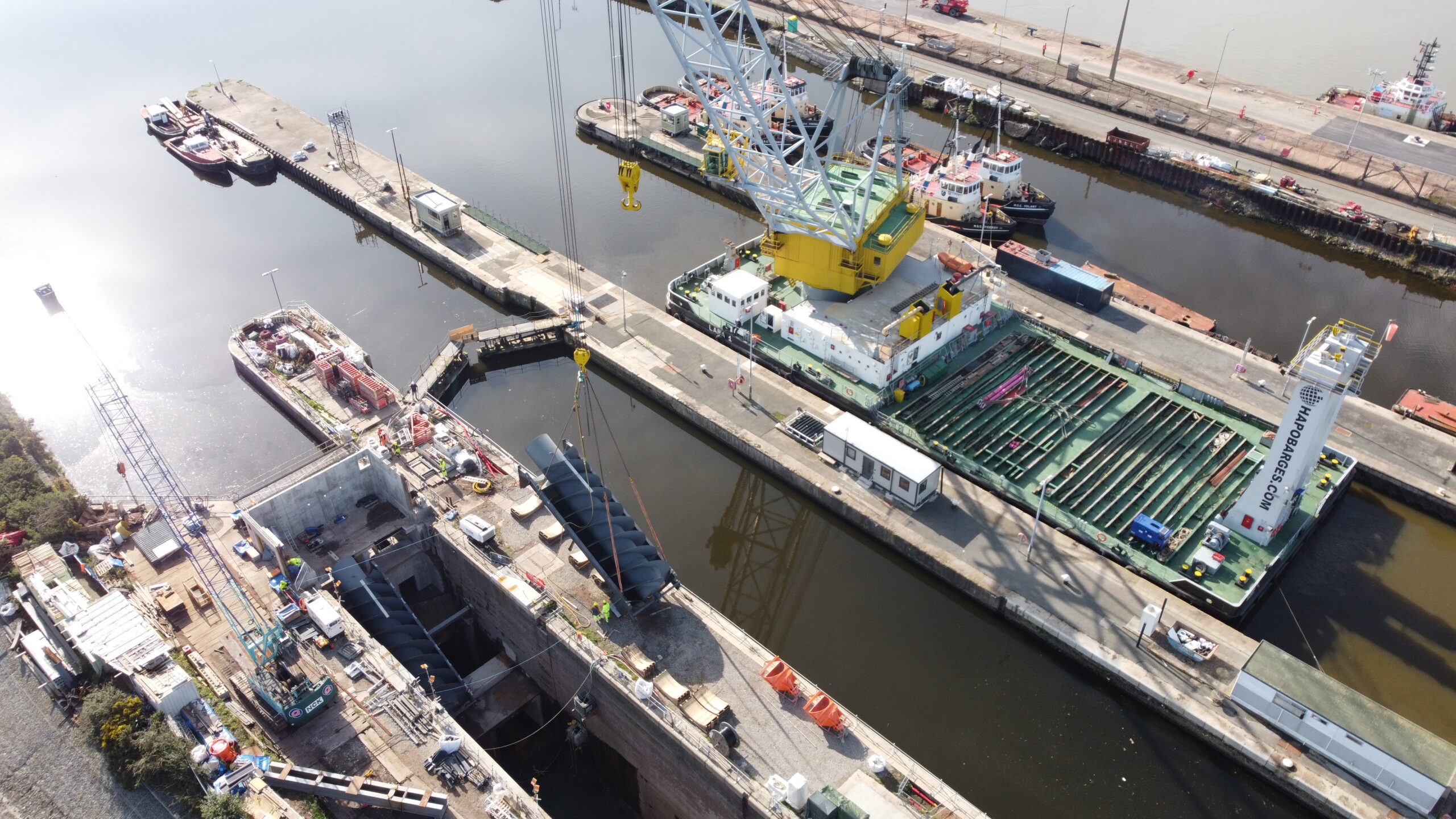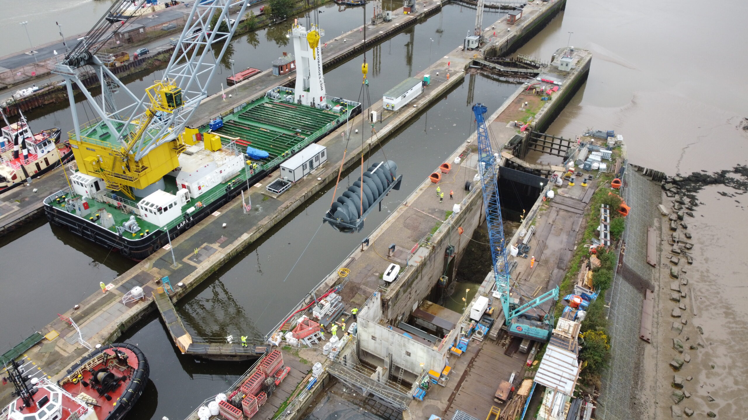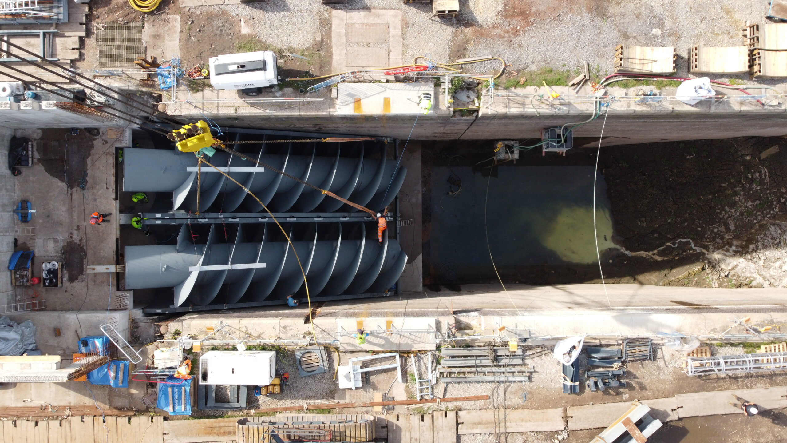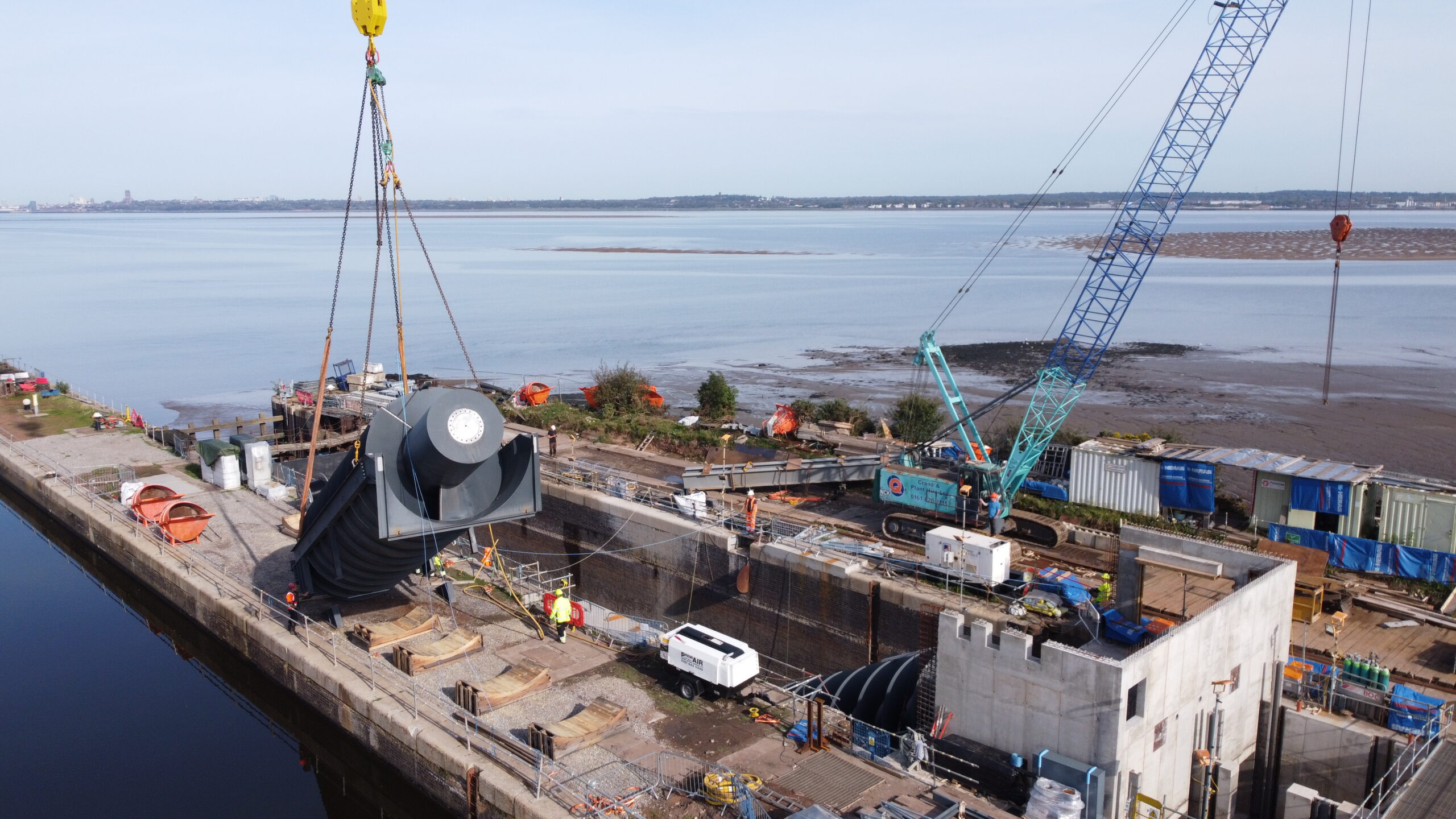 Moderní vodní elektrárna využívající Archimédovy šrouby pro ekologickou výrobu energie ze spádu mezi řekou Mersey a Manchester Ship Canal.